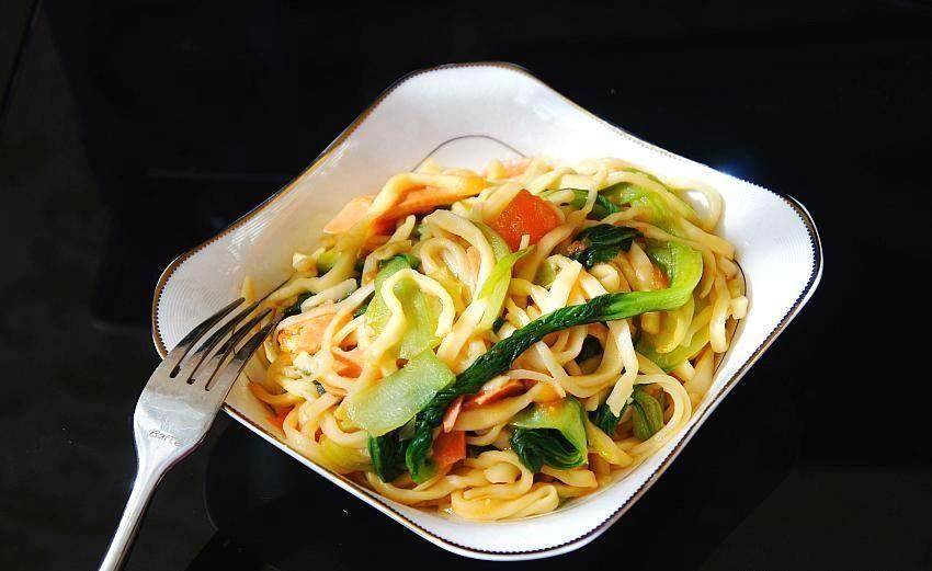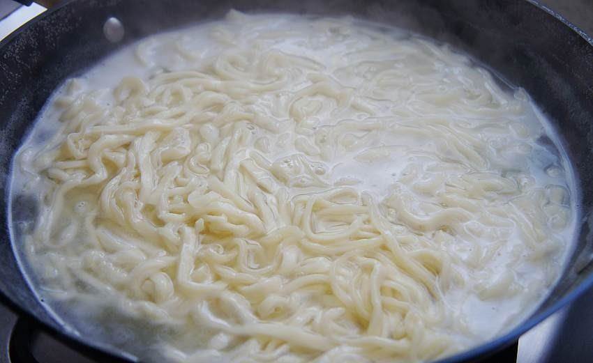 做法:煮面條,鍋中水開下入手搟面,煮開澆冷水,再煮開再澆冷水,最后煮開即可撈出,過冷水,控凈水分。
