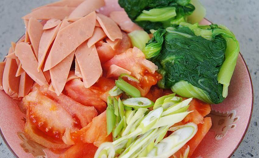 西紅柿洗凈切塊,火腿腸切片,蔥去皮洗凈切碎。