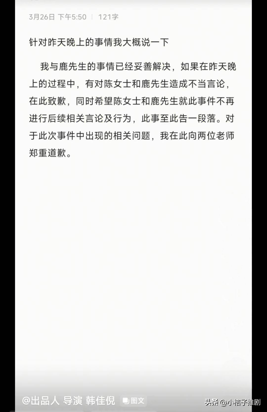 她發文公開道歉了,說是和的矛盾已經妥善解決了,希望和陳不要讓這件事再持續發酵了