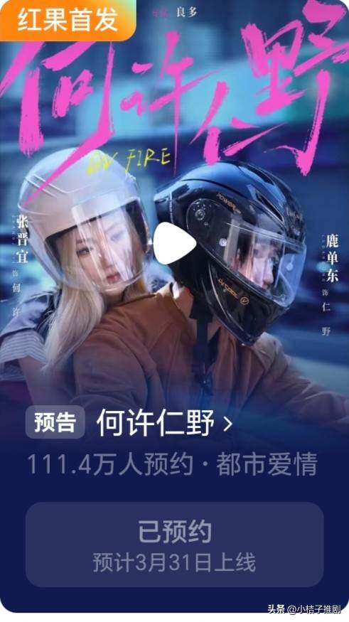 還有一部待播劇《何許仁野》, 二搭張晉宜,首發短劇,預約量已經有111.4萬人了,目前定檔3.31號上線