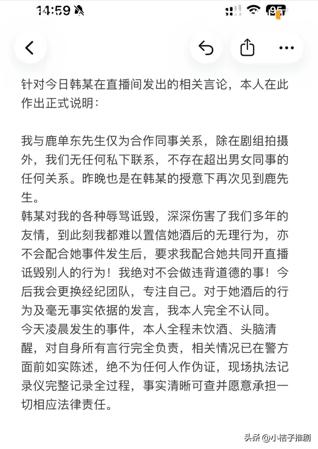 而且還說韓在酒後對她進行了各種辱罵詆譭,傷害了她們的友誼,對于韓酒後的行為和沒有事實依據的發言不認同,也不會去違背道德的詆譭