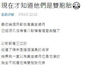貼文曝光後,不少網友也非常驚訝,「嚇到欸!那時候想說這個人怎麼胖瘦這麼快」、「我一直以為只有一個人」、「什麼!!我超愛看八點檔都不知道有兩個人!太震驚」、「哇噻,顛覆我的童年」、「有次滑到陳宇風生日發照片,才知道他是雙胞胎,他們真的長得一模一樣欸」。