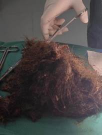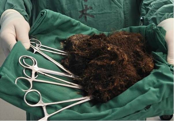 成團的異物包塊表面全是密密麻麻的頭髮,由于頭髮無法被胃液消化、也很難把它們排出去,在胃酸的作用下,頭髮與食物殘渣及其他胃內容物混合,像滾雪球似的越變越大、越變越硬逐漸形成堅硬的「胃石」,在臨床上稱為「毛石癥」。