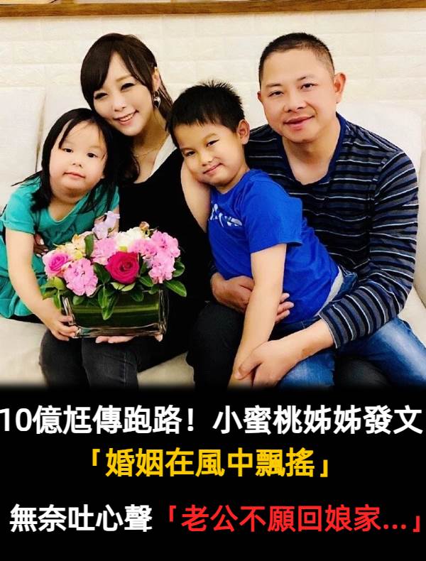 據《自由時報》報導,小蜜桃姐姐當年為了完成媽媽的心願,答應才追求3個月的李慎言,兩人迅速步入禮堂完成終身大事,引起很多人的討論,原本嫁給10億身家的富商,也算是好事一樁,她也因為長年跟老公住在中國,在家相夫教子之外,也發展自己的事業,過得相當幸福;孰料幾年前卻傳出,李慎言在外欠下的千萬元的債務,甚至影響家庭生計,無法還款只好跑路,讓她獨守空閨,她也罕見PO文,抒發對多年婚姻的心聲了。