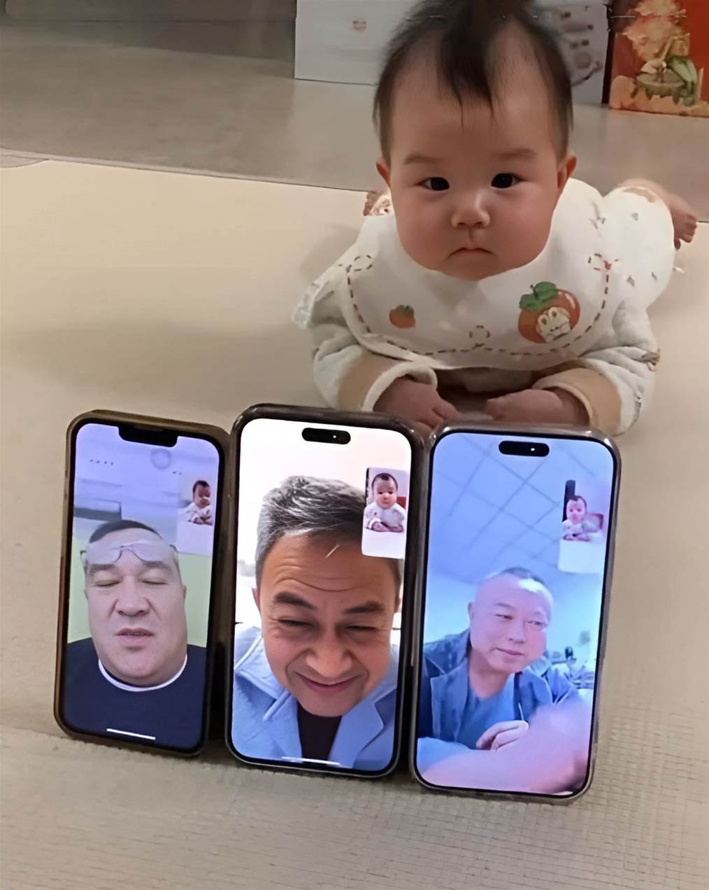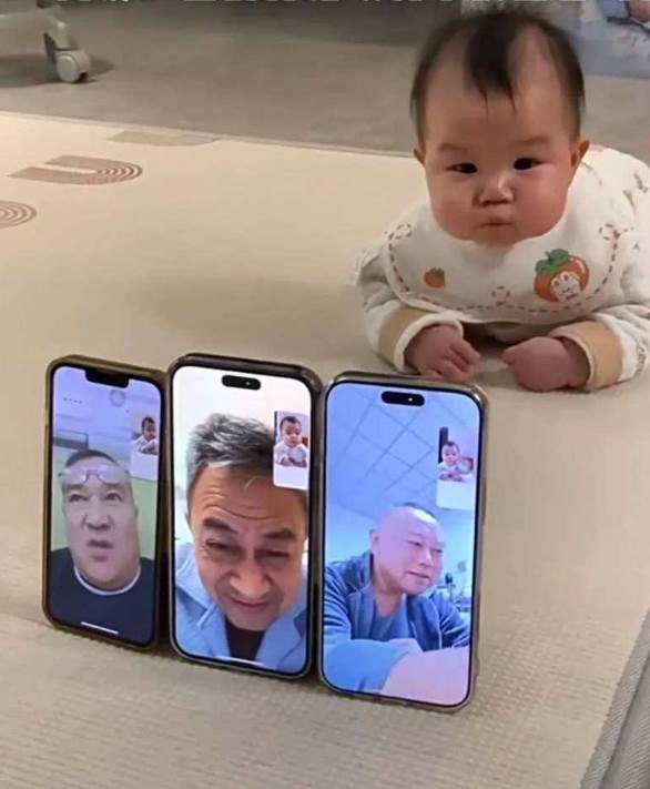這位寶媽用了一個聰明的方法:將三部手機同時開啟視訊通話,讓小寶寶「一次性」滿足三方長輩對孫兒的關心需求。