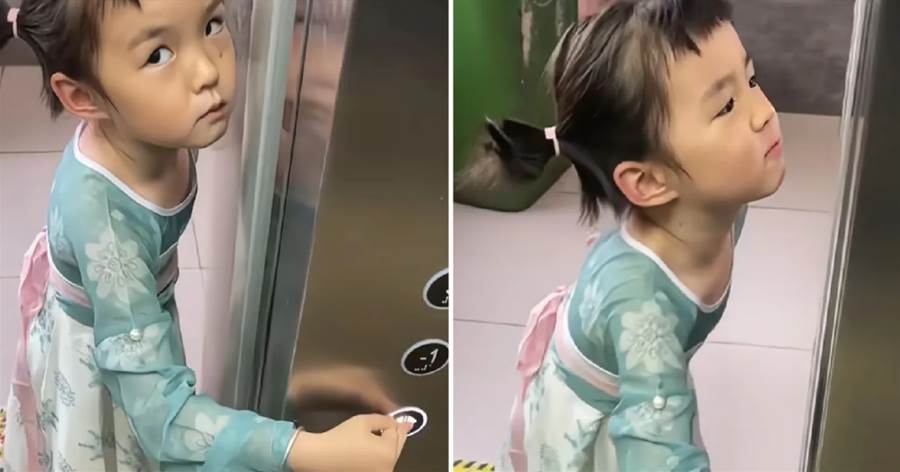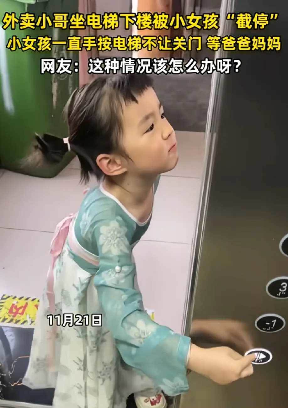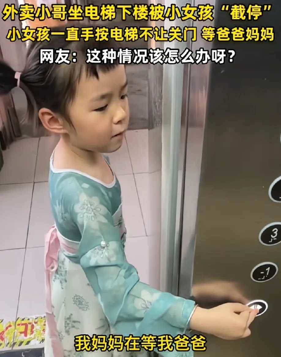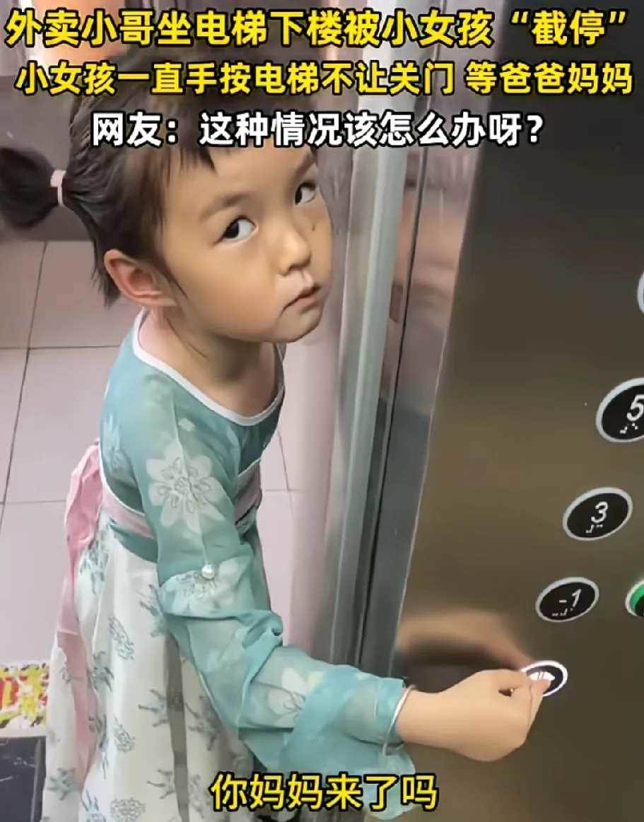 狹窄的電梯廂內,氣氛有些微妙。穿著藍白印花連衣裙、頭髮上別著粉色髮圈的小女孩,大概五六歲的樣子,她小小的身體擋在電梯門口,雙手固執地按著開門按鈕,眼睛不時望向空蕩的走廊。她身旁是一位身著黃色外賣制服的騎手,手裡提著餐盒,表情焦急,頻頻看向手錶,卻對眼前這個小小的「路障」無可奈何。