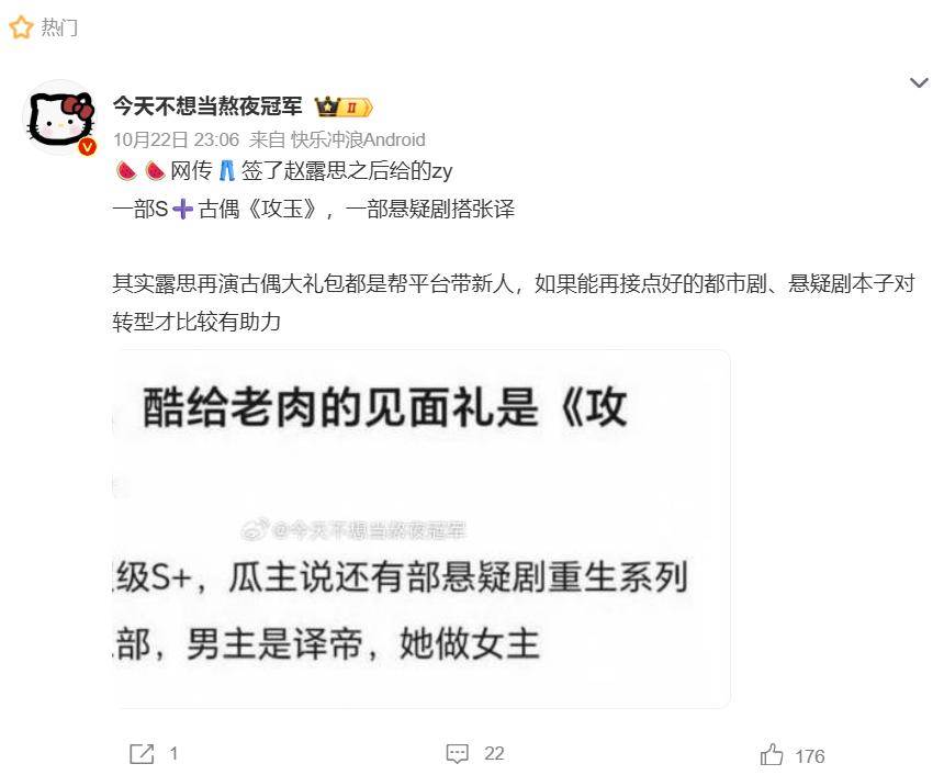 從網上爆料看,趙露思簽約虎鯨之后的資源還是很頂的。之前官宣影視化的《攻玉》給了她,接下來還有和張譯合作的懸疑作品,看得出來是精心挑選的。