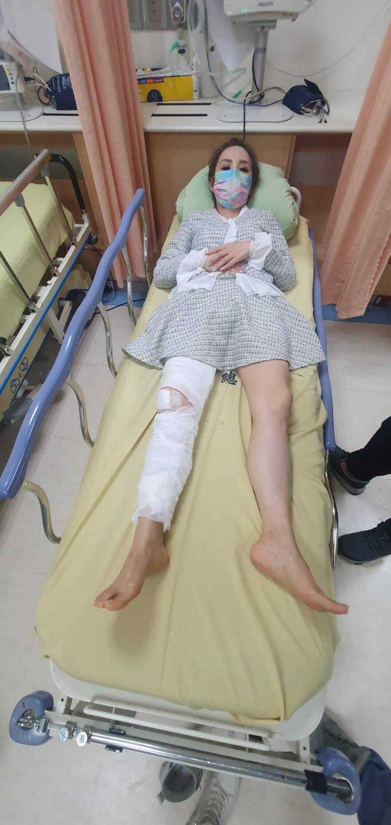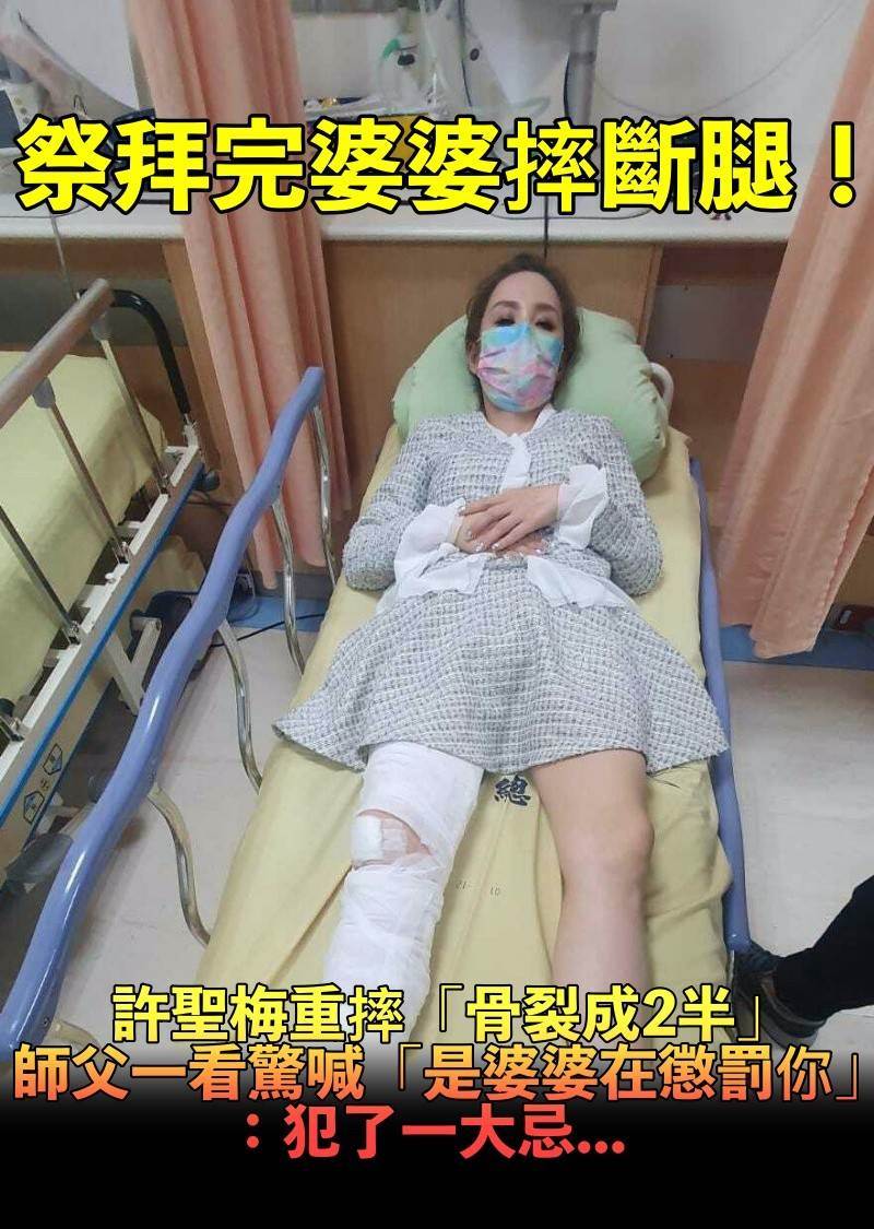 當時許聖梅還PO出重摔骨折的慘況:「膝蓋直接撞擊地面,軟骨碎成了兩半,然後就只能靜靜地躺在床上。雖然很折磨,但也只能接受。骨折真是老天給人在身心靈一個殘酷的考驗。」後來她也沒多想堅強療傷養病,由于畫面十分怵目驚心,當時還引起許多網友關心,而許聖梅還樂觀自我安慰:「之前為照顧婆婆買的助行器和輪椅,她幾乎沒用到,而我,竟然就全盤接收了。