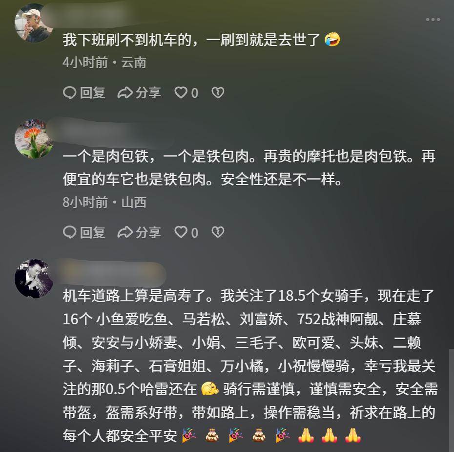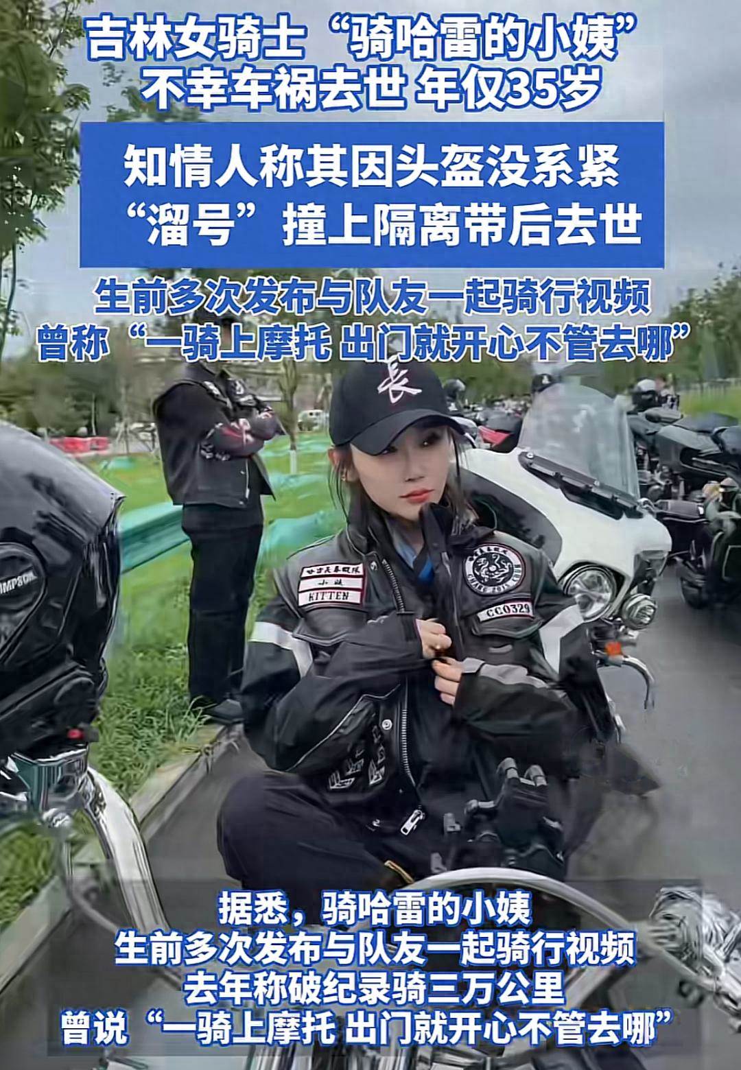 其實從2020年開始,一位網絡昵稱為「二賴子」的機車網紅騎手因交通事故意外離世,到2025年7月此次網紅女騎手「騎哈雷的小姨」的離世,這些鮮活的生命因為各種各樣的意外離開人世,讓人痛心不已。
