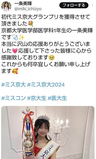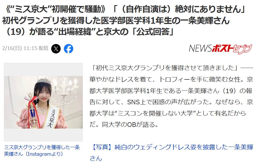 2月8日,來自京都大學醫學部醫學科大一的一條美輝同學在自己的社交平台上發表了自己榮獲初代「MISS京大」的獲獎感言。
