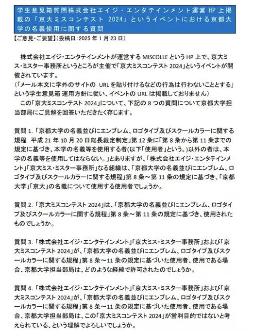 有京都大學的學生向學校反饋箱發了一封有關這個校花活動的八連問質問信,每一個問題都在質疑這個活動的合法性。