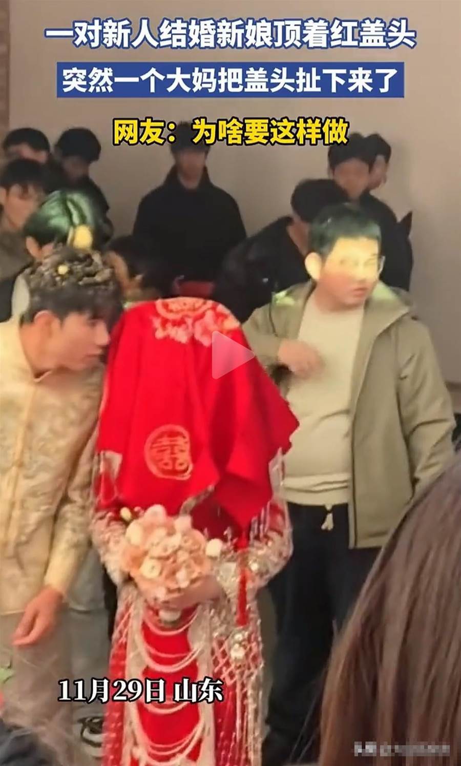 而就在這時,左邊的兩名女子也發現了情況,原來新娘的蓋頭是被一名中年大媽扯下來的。