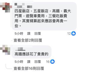 但也有不少人為學校緩頰,「住飯店、搭高鐵能不貴嗎?都貴在這了」、「國旅啊!來都來了」、「四星飯店、五星飯店、高鐵、義大門票、遊覽車費用、三餐吃飯費用,其實精算起來應該會再貴一些」、「個人覺得不貴,而且坐高鐵比較安全,只是行程滿無聊的,但小孩子重點是跟同學玩在一起的感覺。