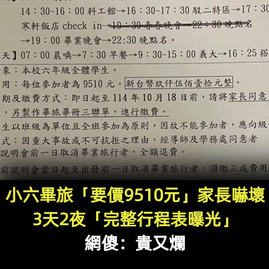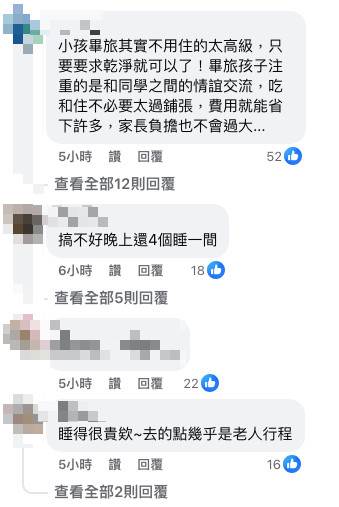 事實上,不久前才有學生抱怨學校安排的三天兩夜畢旅要價7390元,行程包括平溪、九份、台北101及宜蘭景點等,雖然入住四、五星級飯店,但學生仍嫌行程無趣,「哪有人畢旅行程這麼爛又這麼貴啊!我不去了!」,留言區也毀譽參半。