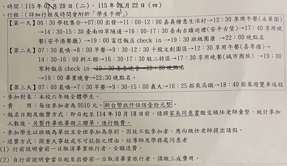 從家長公開的行程表來看,孩子們從嘉義出發,第一天造訪檜意生活村、四草綠色隧道及安平古堡,中午與晚上分別在永華園、安平港餐廳用餐,並入住台南富信飯店;第二天前往十鼓文創園區、科工館和駁二特區,中午與晚上分別在喜粵樓、城市商旅用餐,晚上則入住高雄寒軒飯店;最後一天到義大遊樂園玩樂後,搭乘高鐵返程,最後轉乘遊覽車返校。