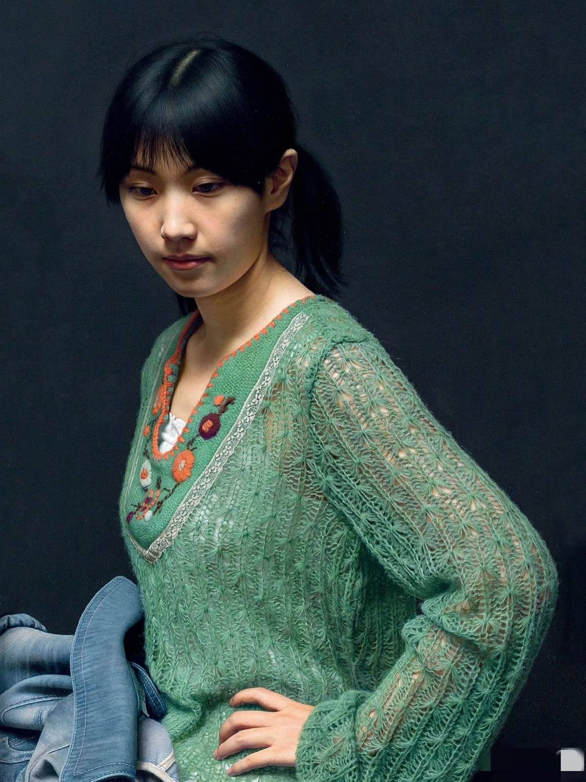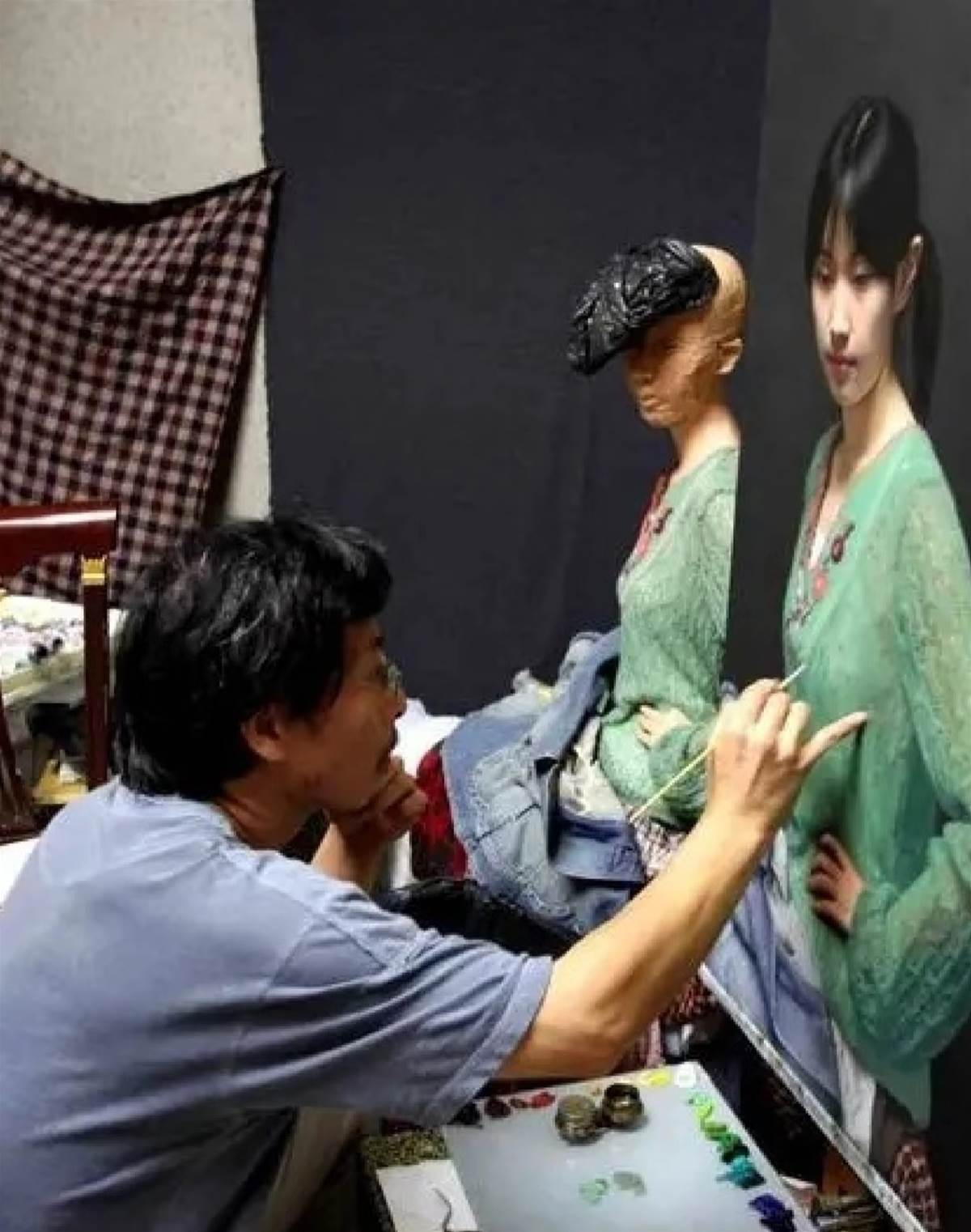 畫裡的綠衣女子低著頭,眉眼間帶著沉思,髮絲紋路、皮膚肌理,甚至細枝末節的瑕疵,都被刻畫得清清楚楚。不少人湊近細看,懷疑這根本不是畫,而是一張高畫質照片。