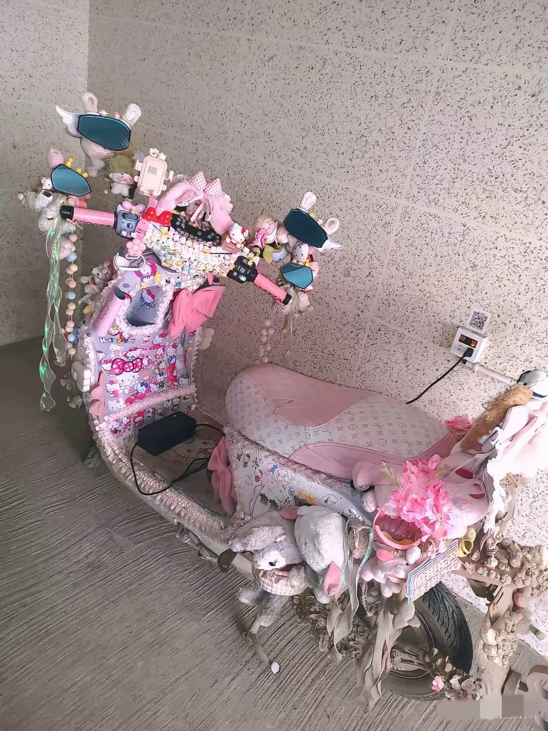 呢唔單止係一架車,更係一座「粉紅城堡」:車身貼滿閃令令星月貼紙,倒後鏡掛住絨毛兔耳罩,車籃坐住草莓熊公仔,連充電口都綁住粉紅胡蝶結。一扭匙,車頭掛住嘅香薰片微微搖晃,飄出蜜桃香——呢架大概係成條街最「搶眼」又最「香」嘅代步工具。