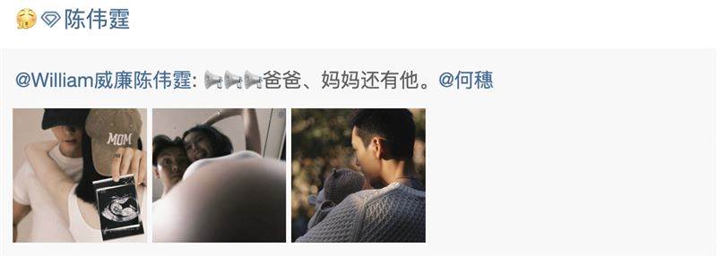 沒想到劇情峰迴綠轉,陳偉霆今日上午在微博曬出三張照片宣告當爸爸了,陳偉霆寫道:「爸爸、媽媽還有他」,文末標註何穗,證實孩子的媽身分,粉絲見狀也紛紛湧入祝福。