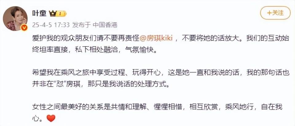二公中公開懟房琪引發爭議后,葉童還特地發文澄清,盡顯體面。