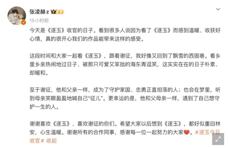 張凌赫也提到「謝徵」後來的生活,「他和父親一樣,成為了守護家國、忠勇正直坦盪的人;也會在夢裡,聽到母親笑眼盈盈地喊自己「徵兒」。更幸運的是,他和父母親一樣,遇到了自己想守護一生的人。」並放上一開始,謝徵以「言正」身分入贅給長玉的照片,引來熱烈討論。