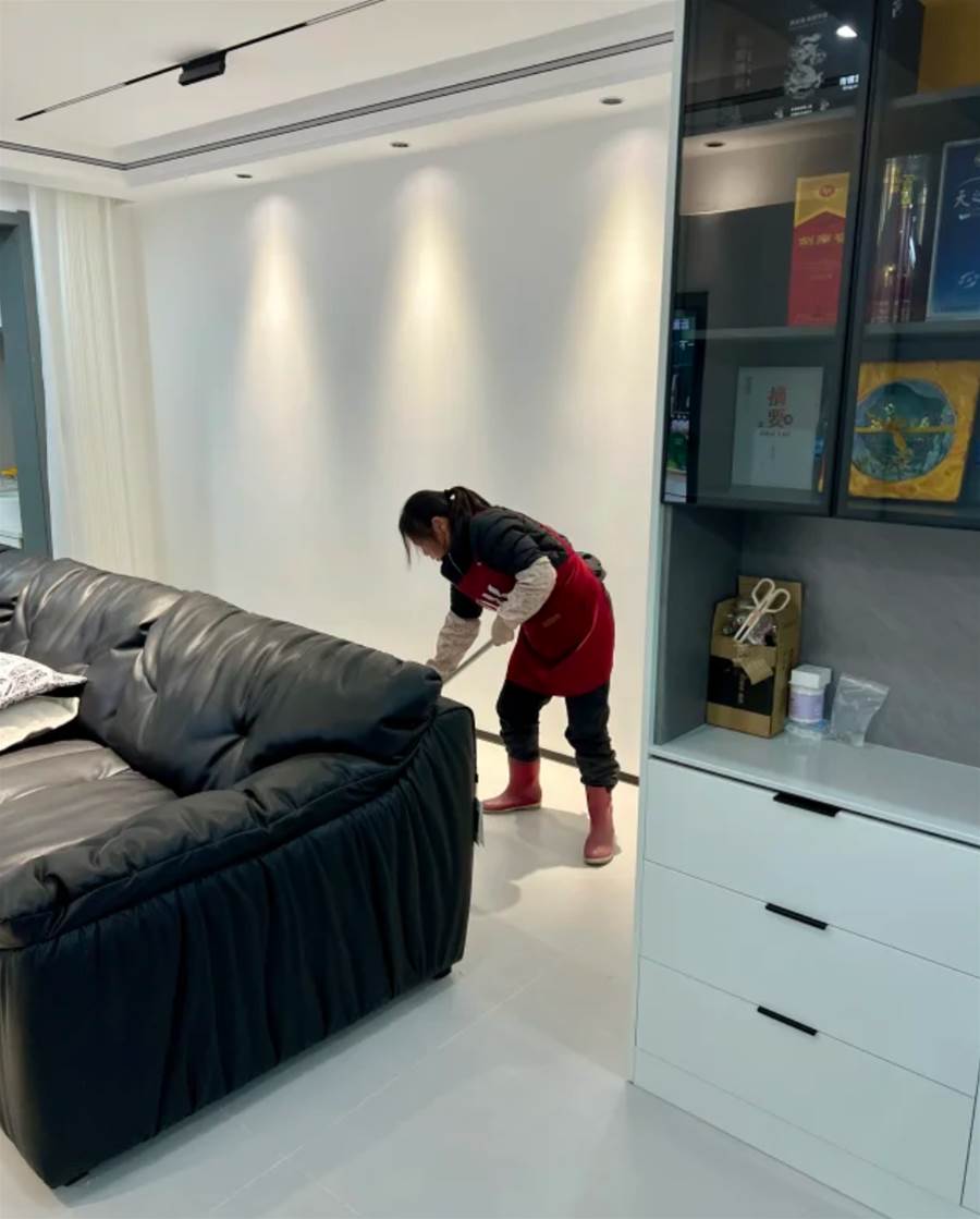 阿姨幹活特別麻利,先從廚房開始,擦油煙機、刷灶臺、清理櫥櫃死角,連地面的油汙都擦得鋥亮,一點汙漬都看不見; 接著又收拾客廳,擦窗戶、拖地面、整理雜物,把散落的玩具一個個歸置好,就連沙發縫隙裡的灰塵都用吸塵器吸得乾乾淨淨;最後去收拾臥室和陽臺,把女兒衣櫃裡剩下的衣服整理整齊,還細心地把疊好的衣服分好類,放進衣櫃的不同格子裡。