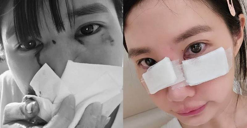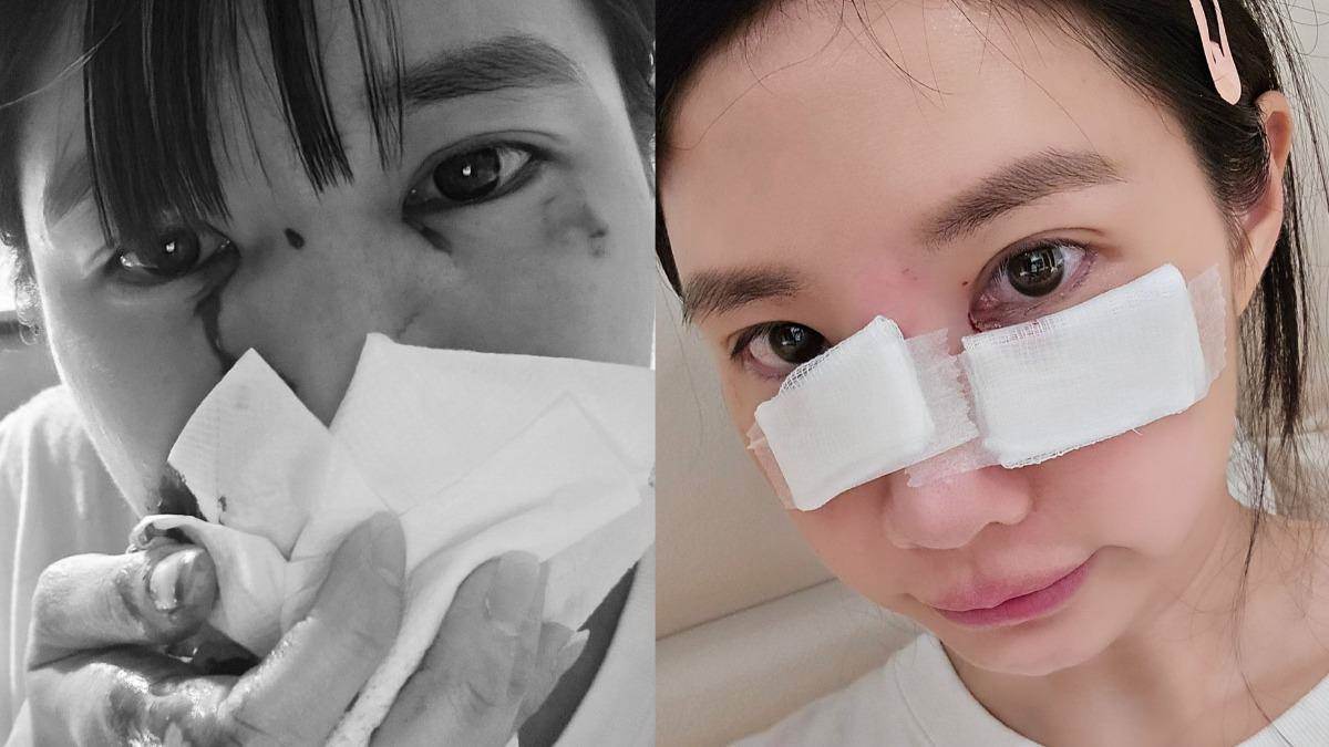 照片中可以看見她痛苦摀臉,衛生紙與手都沾滿血跡,靠近眼睛的部分也有血不斷流出,畫面看起來相當驚悚。