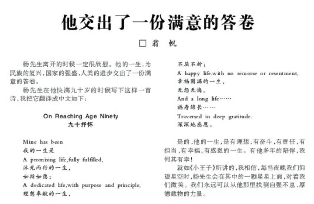 或許,在翁帆28歲的時候,決意嫁給82歲楊振寧的那刻起,就注定了她的平不凡。103歲的年紀離開這個世界,顯然無憾了。就如翁帆在10月19日向《光明日報》上發文緬懷丈夫時,說道:「他交出了一份滿意的答卷。」