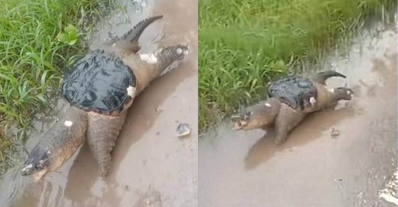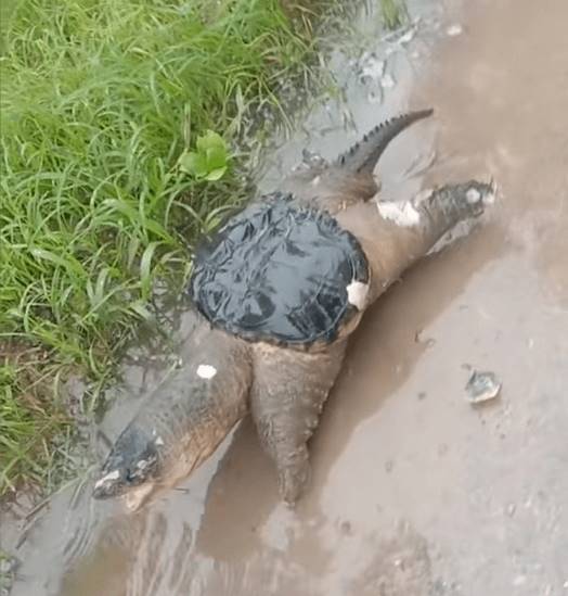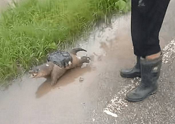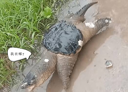 這天的大雨過後,一名鄉下的鏟屎官幹完農活回家的時候,遠遠地看見積水的馬路上出現了一個動物,起初也沒認出來,只知道這隻動物看起來很奇怪,如果不是因為體積太大,