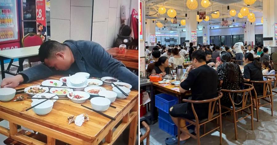 眾人回頭,只見張先生整個上半身趴伏在餐桌上,臉側向一邊。桌上還擺著未撤走的餐盤。
