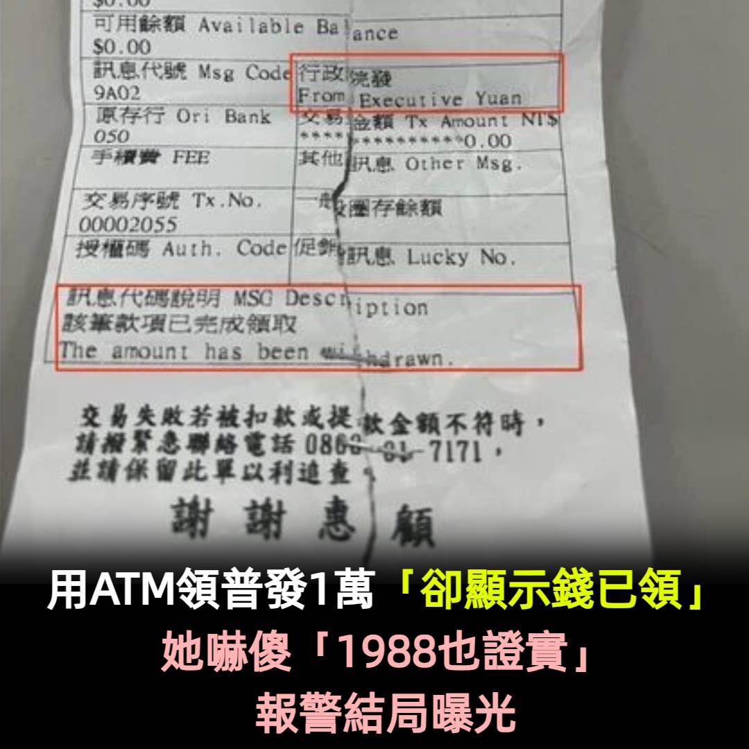 根據《ETtoday新聞雲》報導,新北蘆洲一位44歲吳姓民眾,日前想提領政府普發的1萬元現金,未料在操作提款機時,螢幕竟然顯示款項「已完成領取」,讓她當場嚇壞,擔心遭到不明人士盜領,趕緊向警方求助。