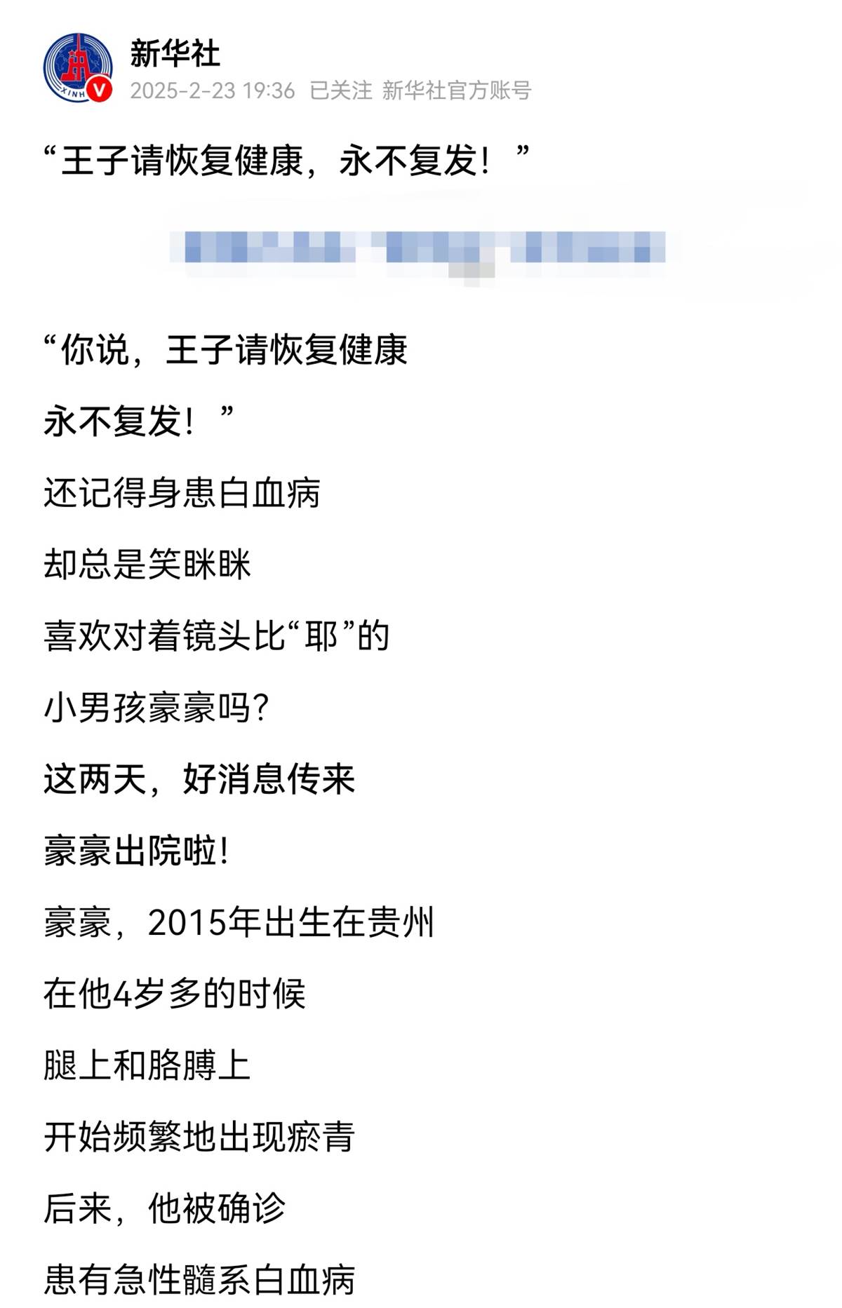 這句話曾感動了無數網友,並引起了主流媒體的關注和報道,貴州男孩豪豪4歲患上白血病,先後經歷了17次化療,扎了無數次的針,吃了數不清的藥。
