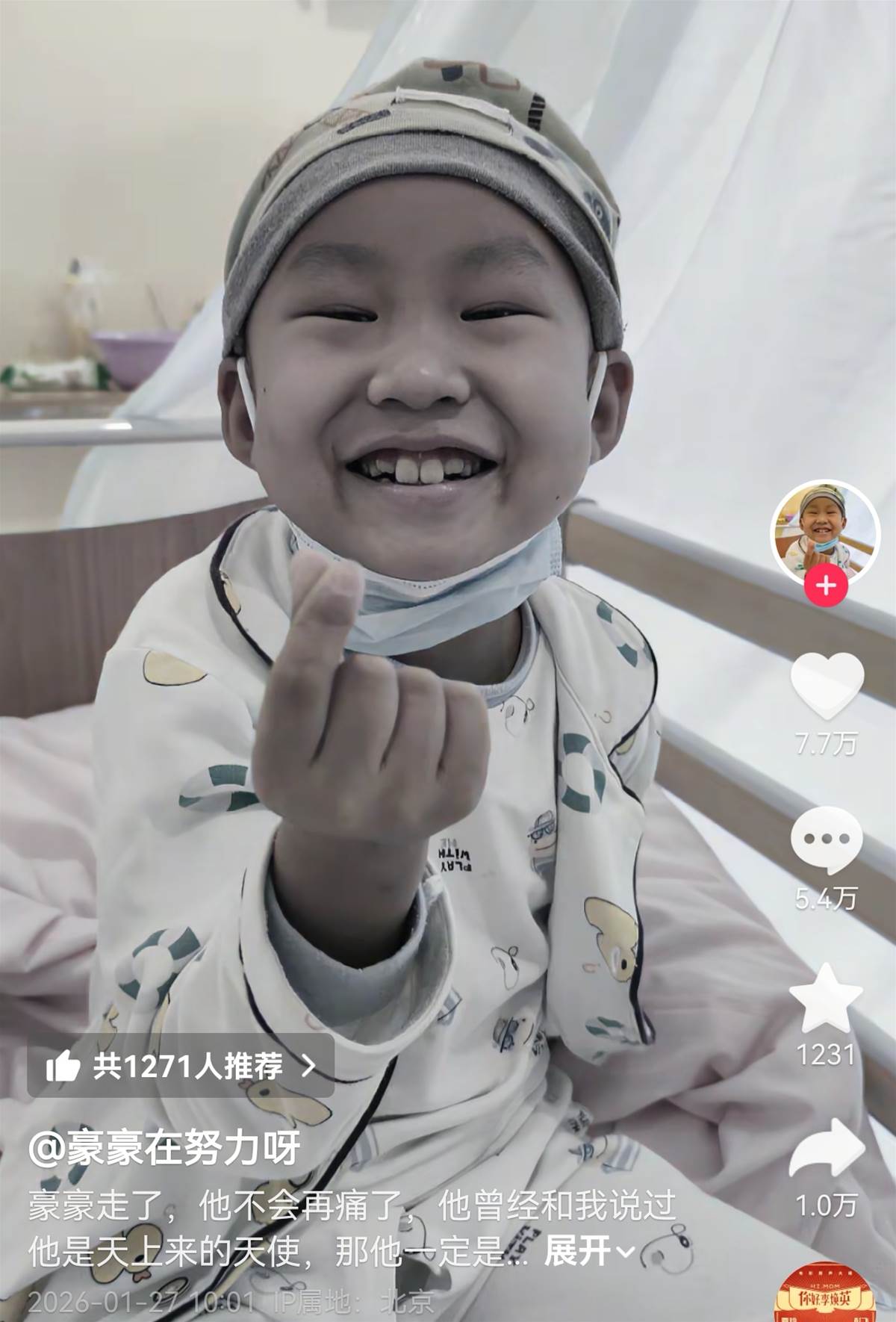 1月27日上午,豪豪的家屬在社交媒體發文,稱豪豪走了,他不會再痛了,已經去了天上當天使了……