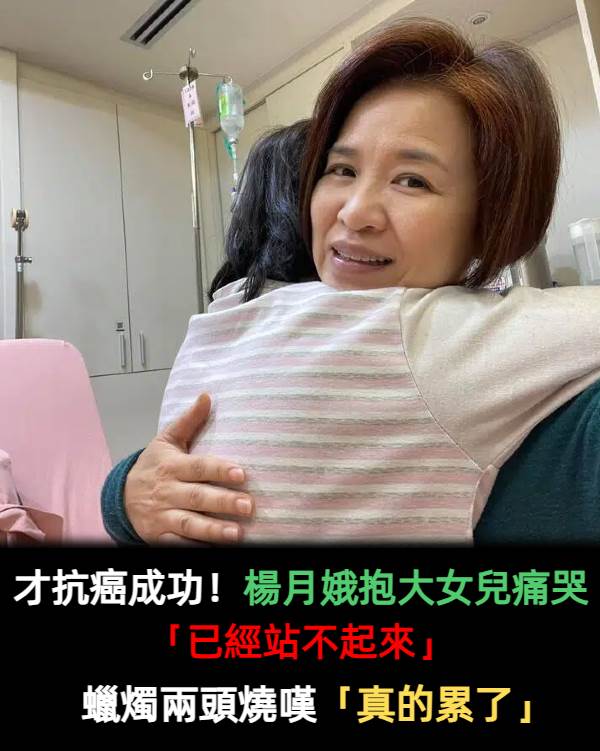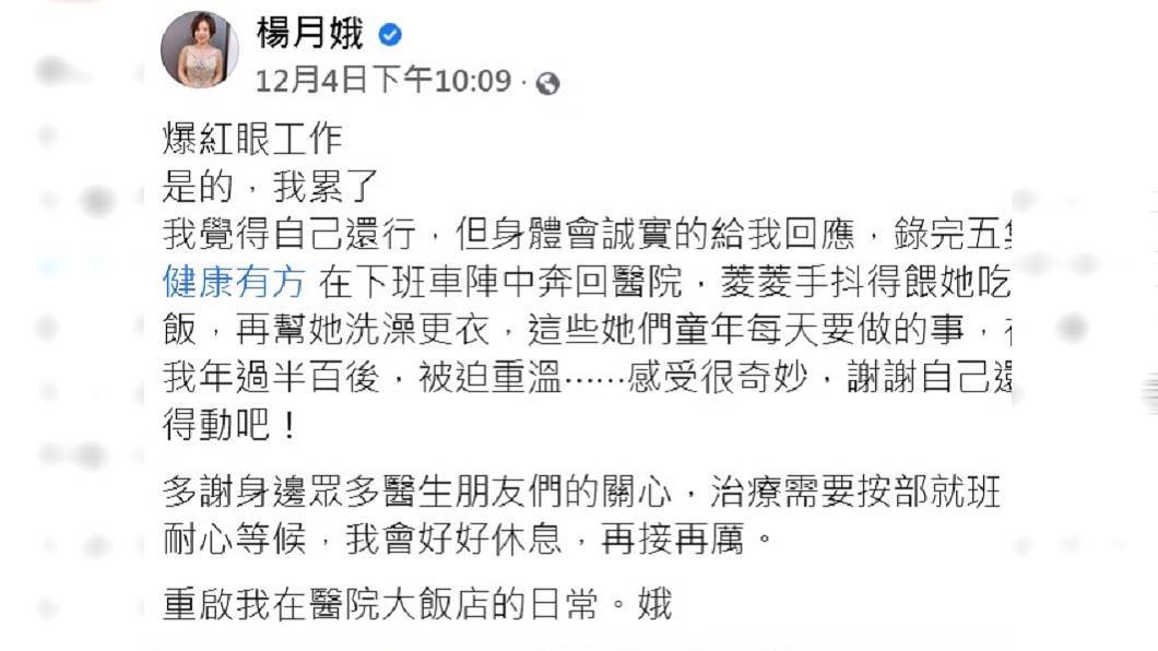 據《TVBS》報導,楊月娥為照顧長女,當時在醫院住了整整一周,女兒會手抖、頭痛、頭暈、站不住,每夜癥狀反反覆覆數十次,讓身為媽媽的她看在眼裡、痛在心底,每次錄完影就趕去醫院,為女兒洗澡、餵飯,蠟燭多頭燒的她,以為自己能扛住,但身體卻頻頻發出警訊!