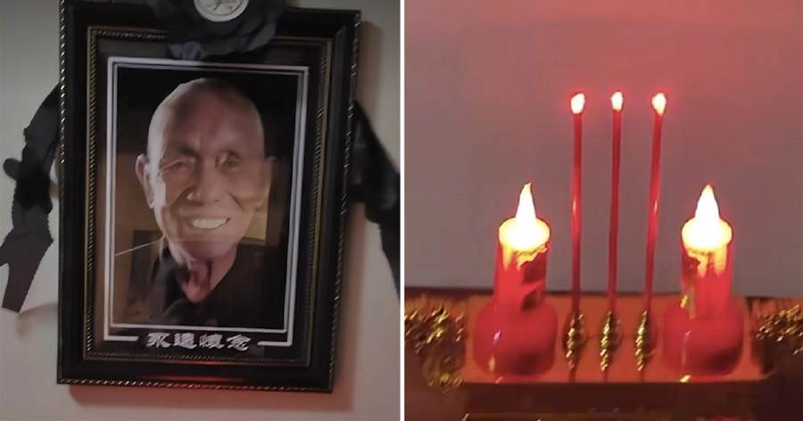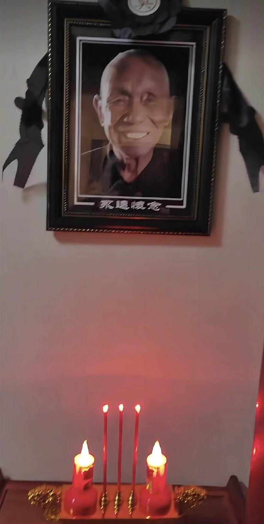 遺照下面,還鄭重其事地擺了一個供臺,上面燃著紅燭,插著三炷香,嫋嫋青煙在昏暗的樓道裡靜靜升起。整個場景莊重、肅穆,甚至帶著一絲不容侵犯的威儀。