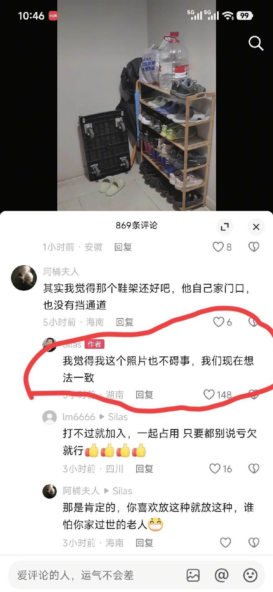 我每天回家都要經過這條樓道。左邊,是鄰居家不斷擴張的「領地」:一個頂天立地的多層木製鞋架塞得滿滿當當,頂上還摞著幾桶大桶水和雜物袋,一輛黑色小拖車和隨意扔在地上的拖鞋,把公共空間擠得水洩不通。物業貼過通知,鄰居嘴上答應,東西卻紋絲不動。每次側身而過,我心裡都憋著一股火,但就像大多數沉默的鄰居一樣,選擇了忍耐。