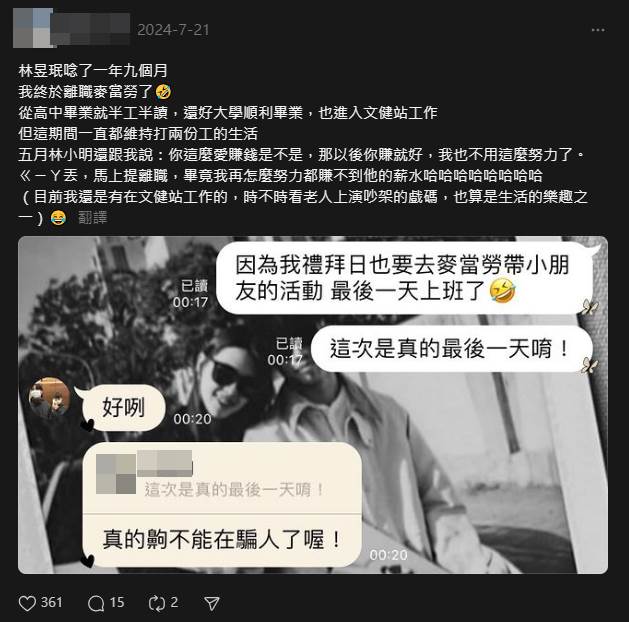 林昱珉的妻子在今年7月時,于Threads上分享生活點滴。她表示,從高中畢業後就開始半工半讀的生活,而打工地點則是常見的速食店麥當勞。
