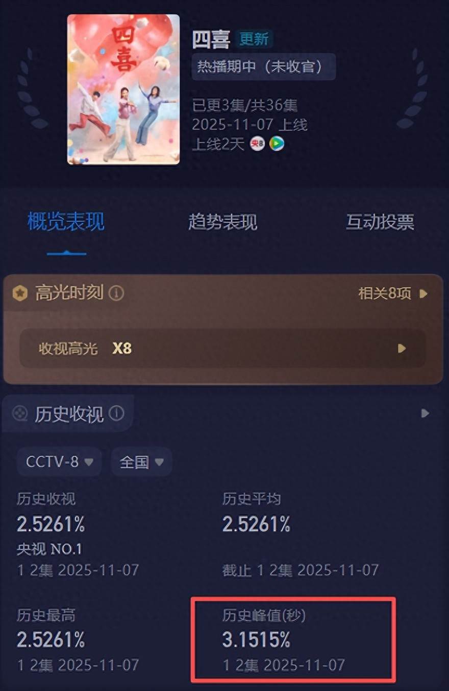 《四喜》上星央視八套,首播收視率峰值就輕鬆破3.1,可謂是爆開入場。