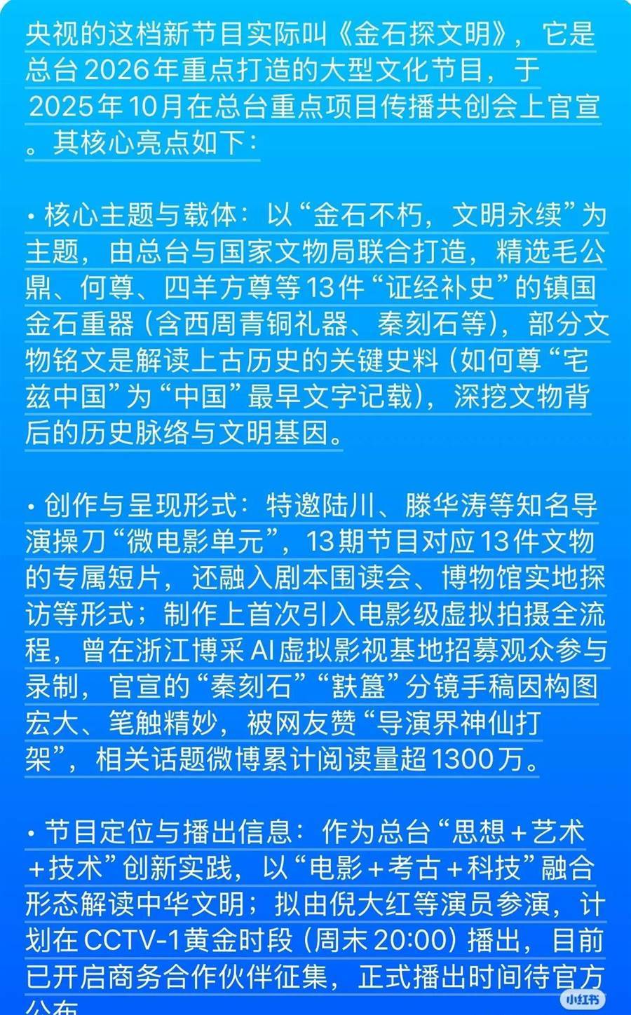 更絕的是這次的配置有多頂:節目是央視總檯和國家文物局聯合打造的,還入選了國家廣電總局重點項目,專門聚焦利簋、毛公鼎這些「鎮國之寶」,用電影化微短片的形式還原歷史,光是這陣仗就知道有多靠譜。