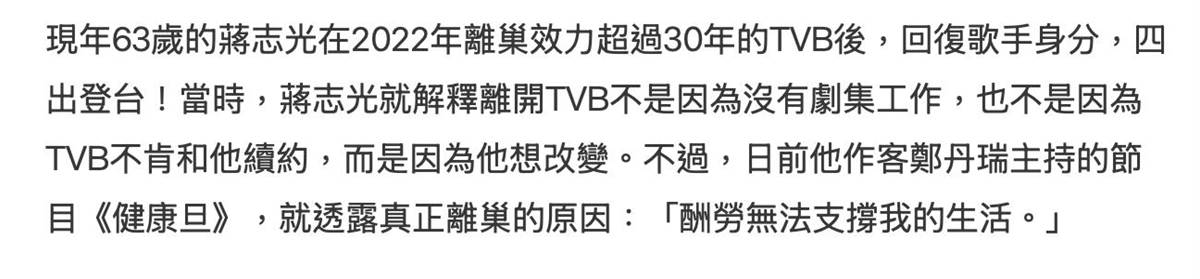 時隔兩年,蔣志光做客鄭丹瑞的節目《健康旦》,在訪談中罕見提及離巢TVB的真正原因,說到底還是因為TVB現階段的酬勞根本無法支撐他的現實生活。