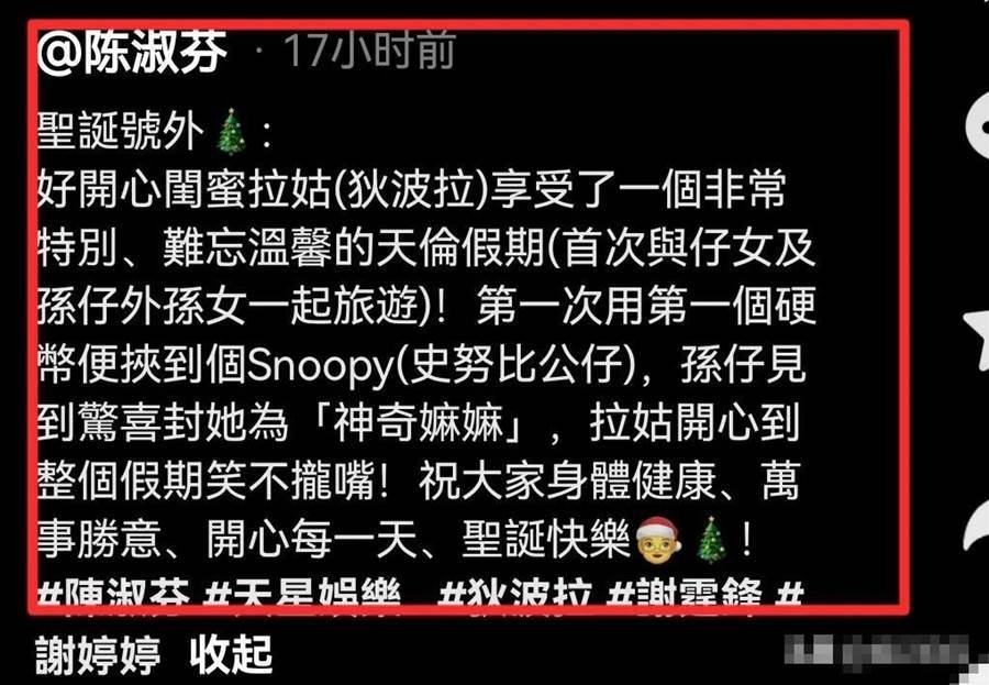 12月26日,圈內「大姐大」陳淑芬突然發文,透露謝霆鋒帶著全家,去了日本旅行。