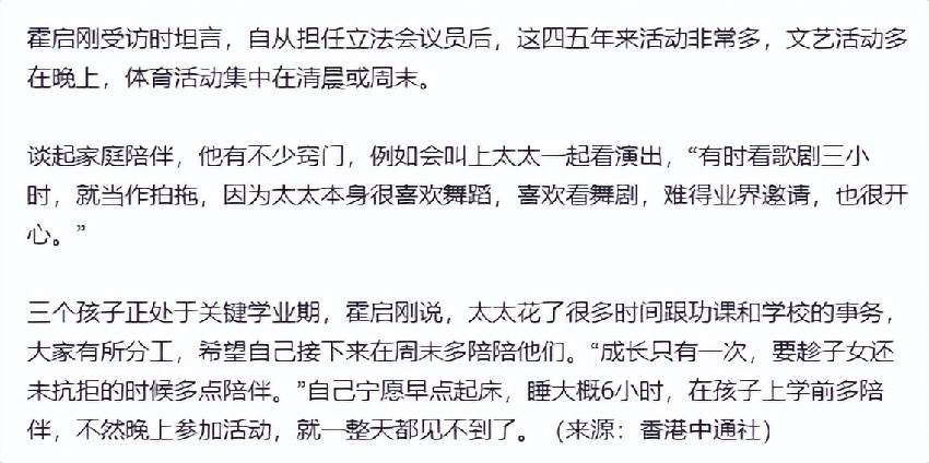 而霍啟剛五年前步入政壇,私事和公事都備受關注,他坦言成為立法會議員后活動非常多,文藝活動大部分在晚上,體育活動則在清晨或周末,所以沒時間和郭晶晶拍拖,不過他也有小竅門,譬如觀看演出時會帶上郭晶晶,三個小時的演出就當拍拖了,而郭晶晶本身很喜歡跳舞。
