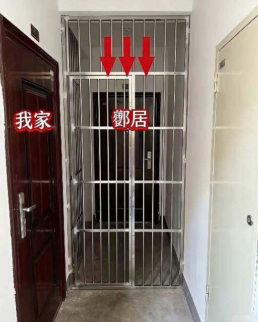 打開門就是密不透風的鐵欄,連走廊都變成鄰居的「私人圍欄」—— 最近香港一戶公屋居民的遭遇,在網上炸開了鍋。照片裡,左側深紅色木門標註「我家」,正對面的鄰居竟在公共走廊中央,裝了一扇高及天花板的不鏽鋼鐵門,把自家門口徹底圍成封閉空間。原本寬敞的走廊,瞬間變成狹窄的「鐵籠通道」,不僅視覺壓迫感拉滿,更讓網友們氣得罵:「這根本是把鄰居當囚犯關!」