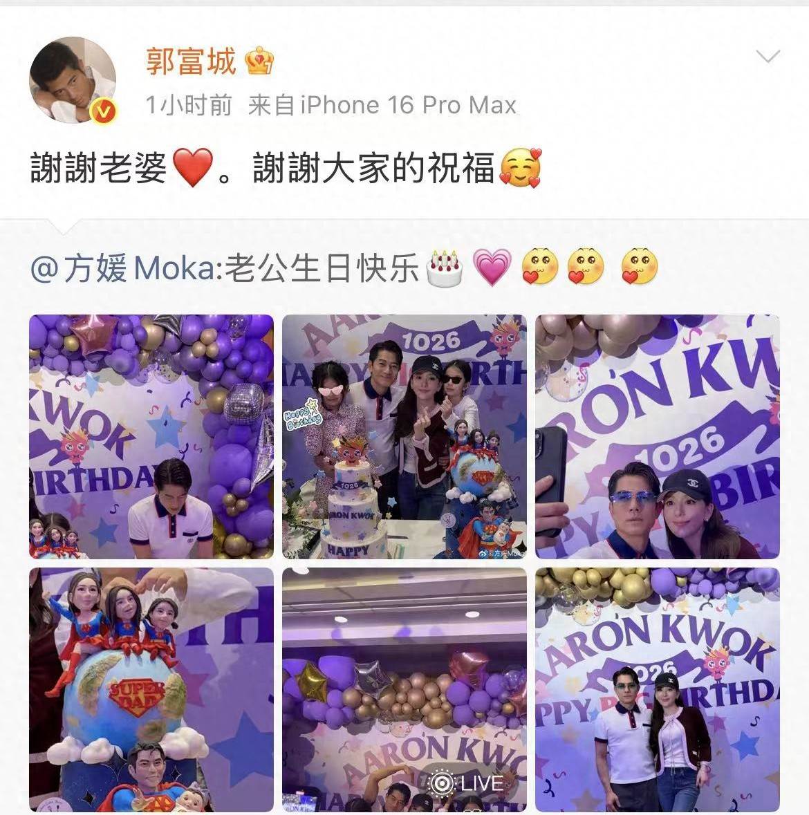 「天王嫂」方媛在26日的最后幾分鐘,為丈夫發布照片慶祝,郭富城也很快轉發,跟老婆秀恩愛。