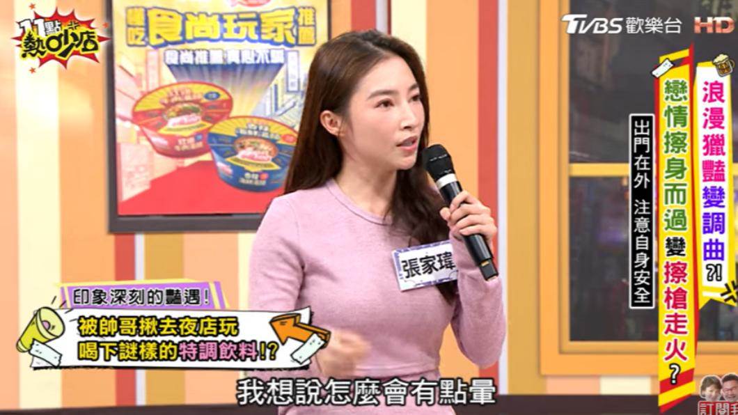 怎料一向紳士的男子,內心卻不單純,那時進去夜店後,張家瑋和其他人點了一樣的飲料,那位男子一如既往舉動紳士,主動幫大家去拿飲料,沒想到拿回來卻對她說:「為妳特調的。」想著對方好意不疑有他,才喝沒多久就發現不對勁,只見她1分鐘後就開始頭暈,5分鐘後就變呆滯,酒量不差的她才喝一點點就沒有力氣了,驚覺被對方下藥。