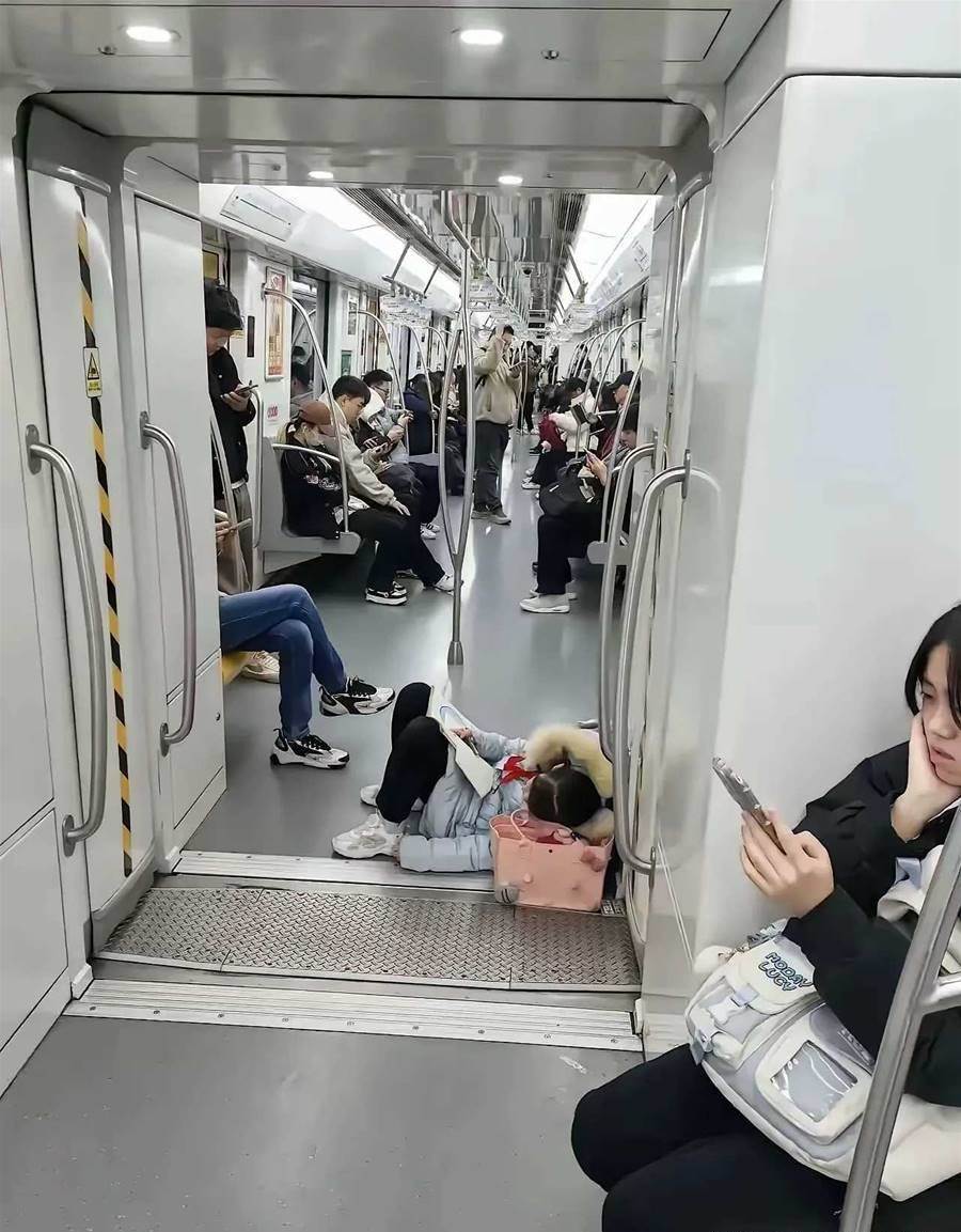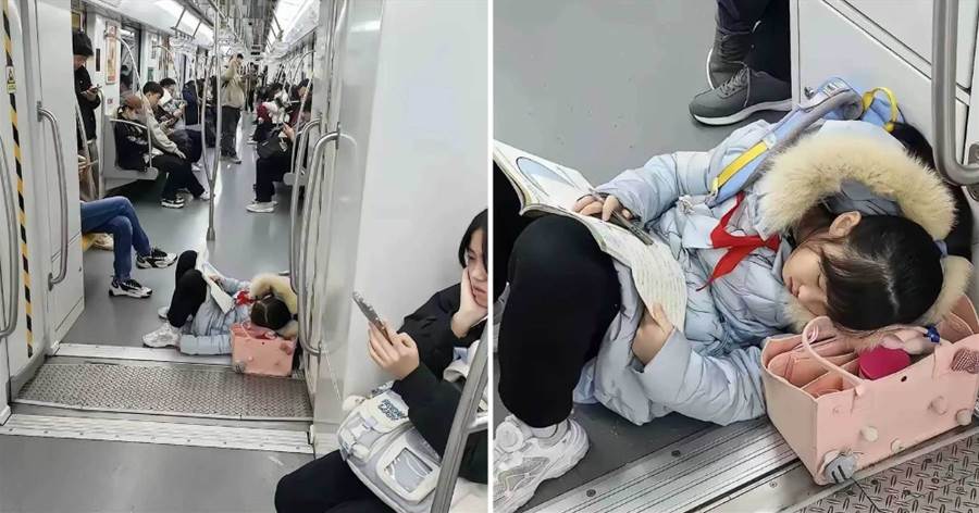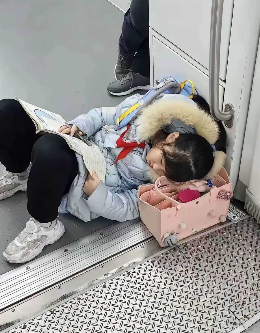 捷運車廂內的嘈雜聲絲毫沒有影響到一個小女孩的安睡。她靜靜地趴在車廂的地面上,身體微微蜷縮著,揹包旁邊是一個粉色的小包包。透過車窗的反射,周圍的人似乎並未注意到這個安靜的角落,直到有人靠近時,才發現她手裡仍緊緊捧著一本練習冊,筆尚未放下,似乎在無意識中繼續「奮鬥」。