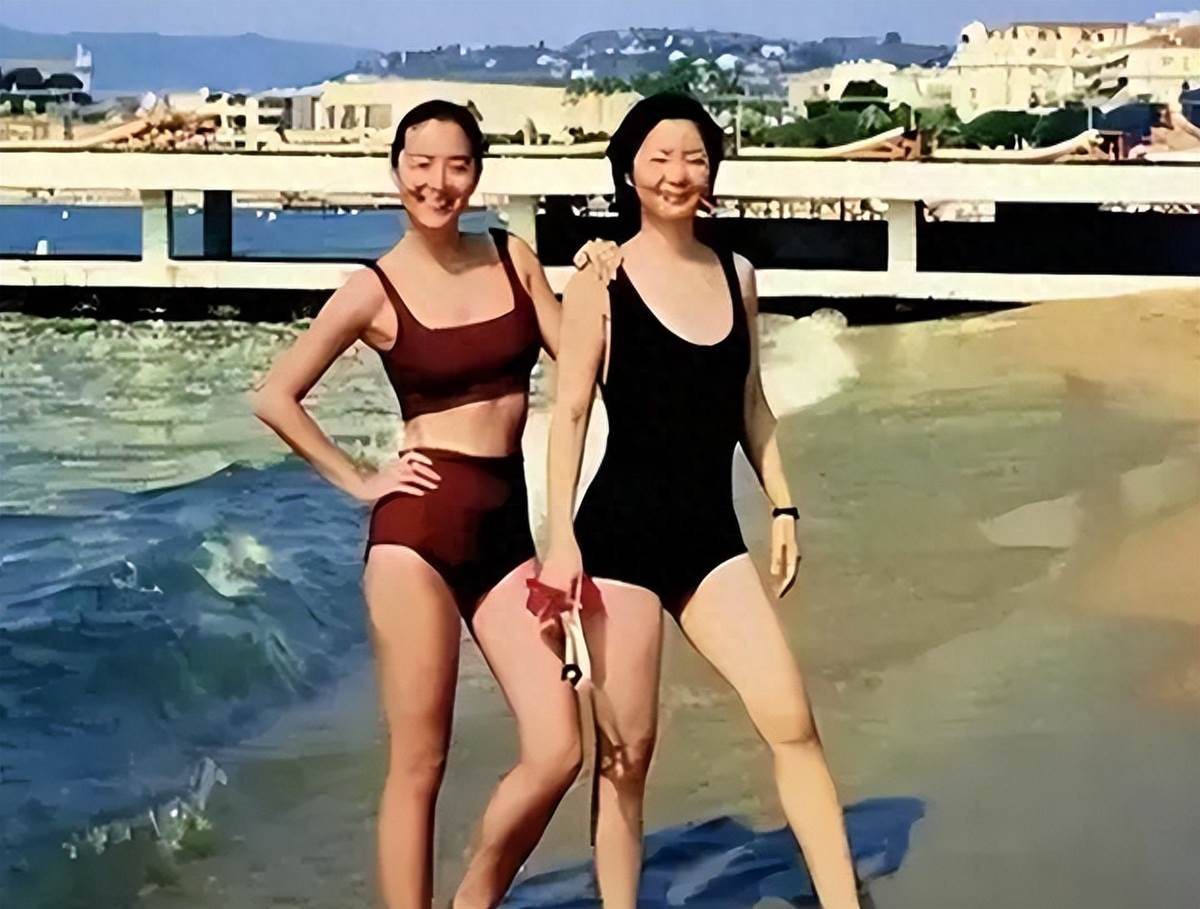 1990年,鄧麗君和林青霞,在法國沙灘度假。