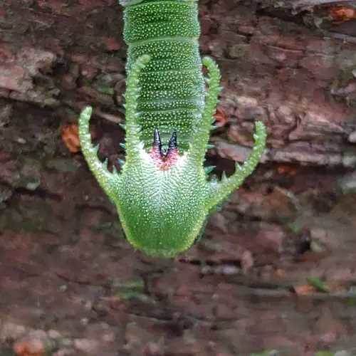 陽明山跑出「野生烈空坐」!眾驚:寶可夢現身近日有山友在臉書社團「發現陽明山」發文,表示意外在陽明山大屯自然公園櫻花樹上,發現神秘的綠色毛毛蟲,其長相十分特別,頭頂擁有4支角與2根刺,讓當事人驚呼抓到寶了,就連同行友人也大讚像是神龍,老公則以「史上最像恐龍」來形容。