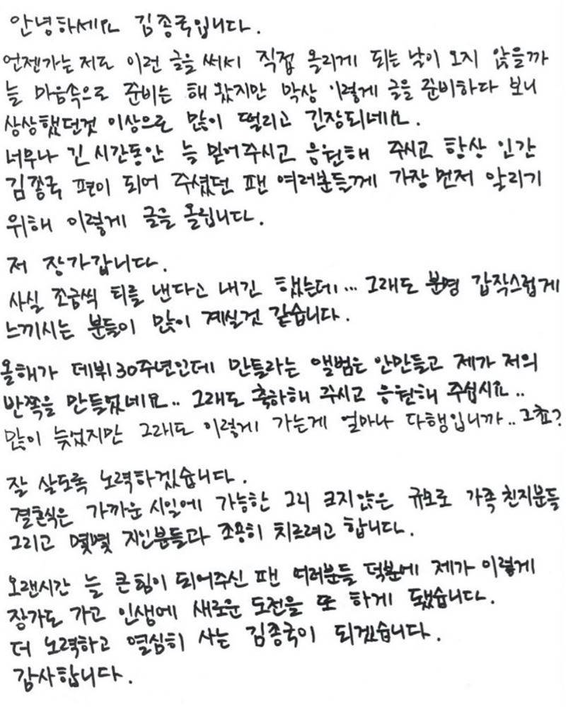 金鍾國手寫信宣布結婚。(圖/翻攝自韓網)