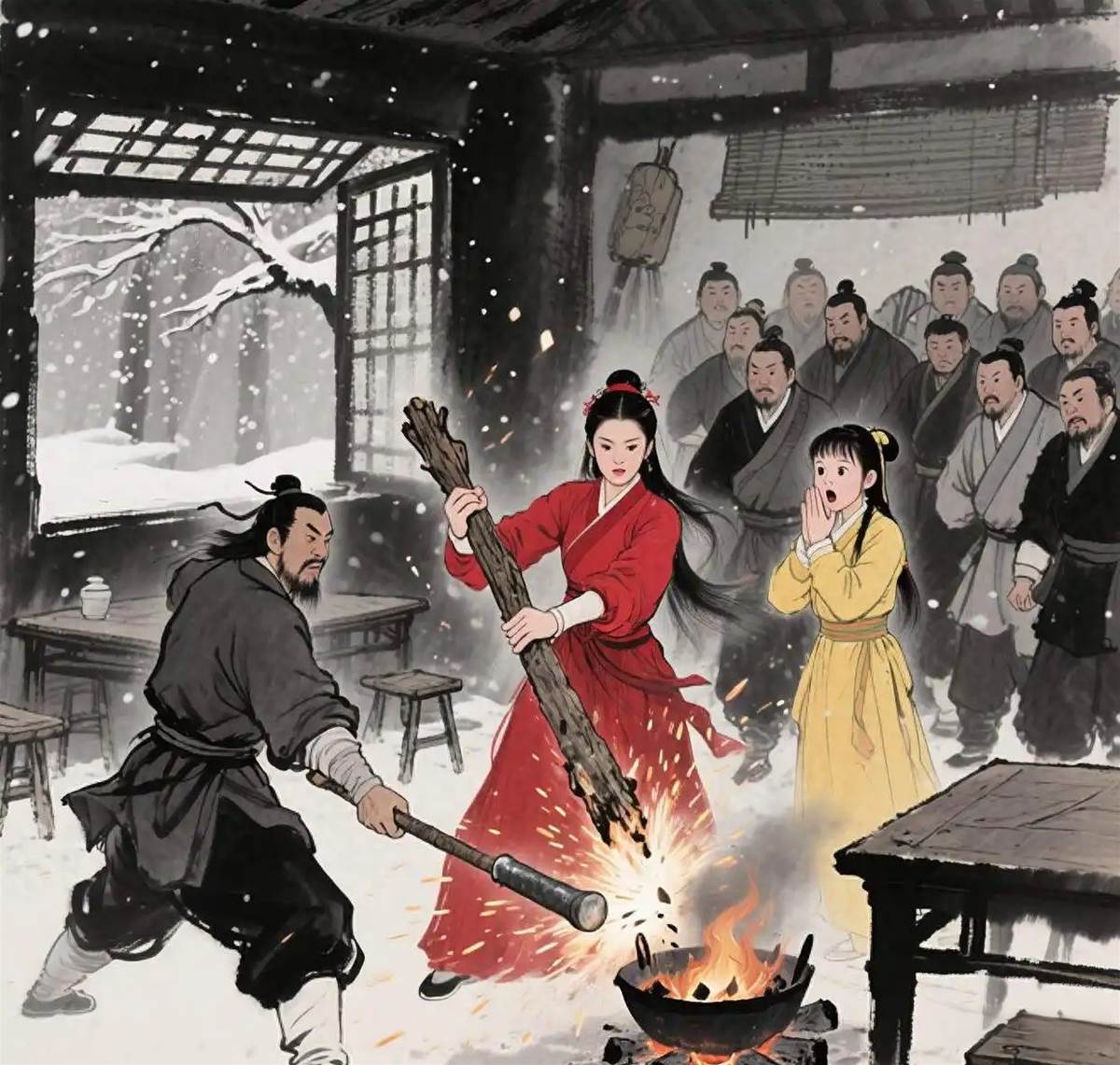 風陵渡口雪夜,當郭襄用金釵換酒結交豪杰時,郭芙正用打狗棒法敲落流浪漢的鐵鉗,「你也配議論朝政?」火星濺在對方胡須上噼啪作響,像極了當年她燒毀楊過草棚的聲音。
