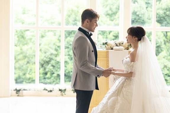 ▲張睿家、黃安若在親友祝福下邁入禮堂,舉行證婚儀式。(圖/LinLi Boutique提供)